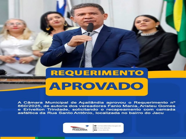 A Câmara Municipal de Açailândia aprovou o Requerimento nº 860/2025, de autoria dos vereadores Fanio Mania, Aristeu Gomes e Erivelton Trindade, solicitando o recapeamento com camada asfáltica da Rua Santo Antônio, localizada no bairro do Jacu.